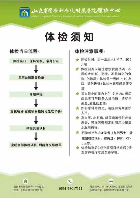 (二)體檢地點(diǎn):山東省醫(yī)學(xué)科學(xué)院附屬醫(yī)院體檢中心(位置:濟(jì)南市無影山38號(hào)(456醫(yī)院對(duì)面)1號(hào)樓查體中心);